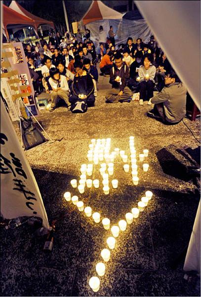 野草莓運動學生昨日晚間在自由廣場搭建靈堂,在「人權」受創的今日,野草莓學生們手持蠟燭為「人權」舉辦公祭,以表達對「人權」最沉重的哀悼! (記者王藝菘攝)