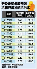 過去勞委會職訓局就業服務站的新登記「求供比」,年平均都在一以上,八十六、八十七年甚至還接近二點五,連前年也有一點二九,每個人至少有一個以上工作機會;但去年平均為零點八七,且從一月的一點二一,二月的一點三三,一路下滑到十二月的零點六,雖然今年一月上升至零點六六,但如以求職求才登記仍在有效期限內的求供比來看,只有零點三二,比去年十二月的零點三五還低。