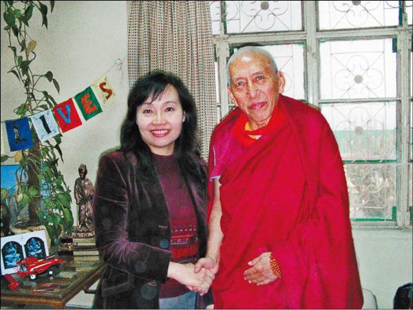 西藏流亡政府總理桑東仁波切(右)和記者合影。 (記者鄒景雯攝)