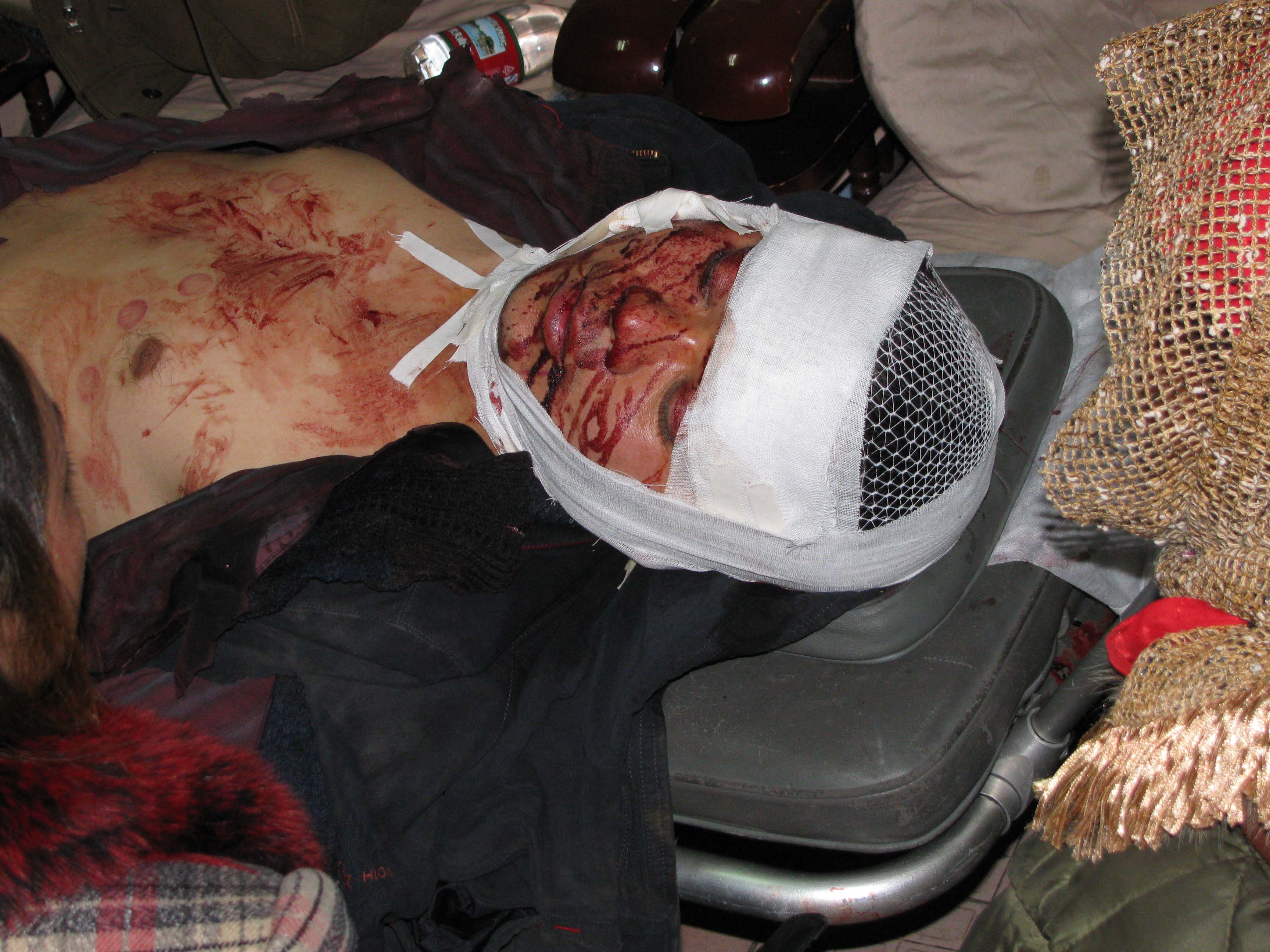 昨天下午一點多左右,記者致電給在醫院關注此事的北京維權人士,他們表示,現在家屬正在華山醫院跟警察交涉轉院,蔣英傑頸動脈被警察用碎玻璃割斷,縫了40多針,頭部裂開4公分的口子,因失血過多,現在他還在昏迷中,老闆姐姐是粉碎性骨折。