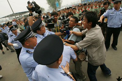 連日來引起香港各界的強烈批評「北京頒布港澳記者採訪新規定」,被認為是言論自由的倒退。圖為去年7月25日,香港多家媒體採訪北京開售奧運門票的混亂情況。(AFP)