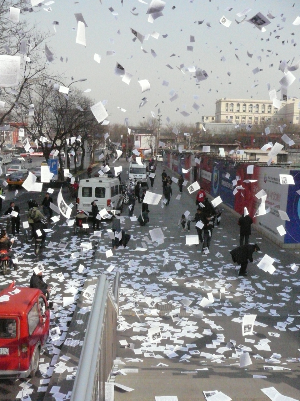 北京朝陽區訪民王永成在兩會期間失去自由,走到哪裡,就有五、六個人跟到哪裡,今天他剛好途經西單,目睹了白花花的傳單從天而降。他說:「我看見撒傳單,因為有6個人看著我,不讓我下車,看見像下雪似的傳單飄下來,有好多人都看見了。」