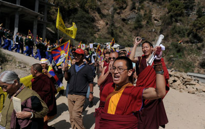 達蘭薩拉,流亡的藏人活動家喊著口號參加3月10號舉行的抗議遊行,以紀念50周年的西藏起義日。(AFP/Getty