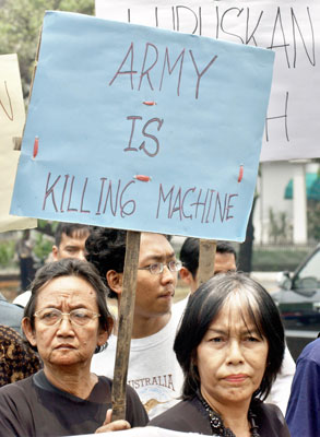 05年9月,雅加達總統府外的抗議者要求政府將踐踏人權的前總統蘇哈托送上法庭,為他在65年後的進行的大規模屠殺負責。(AFP)