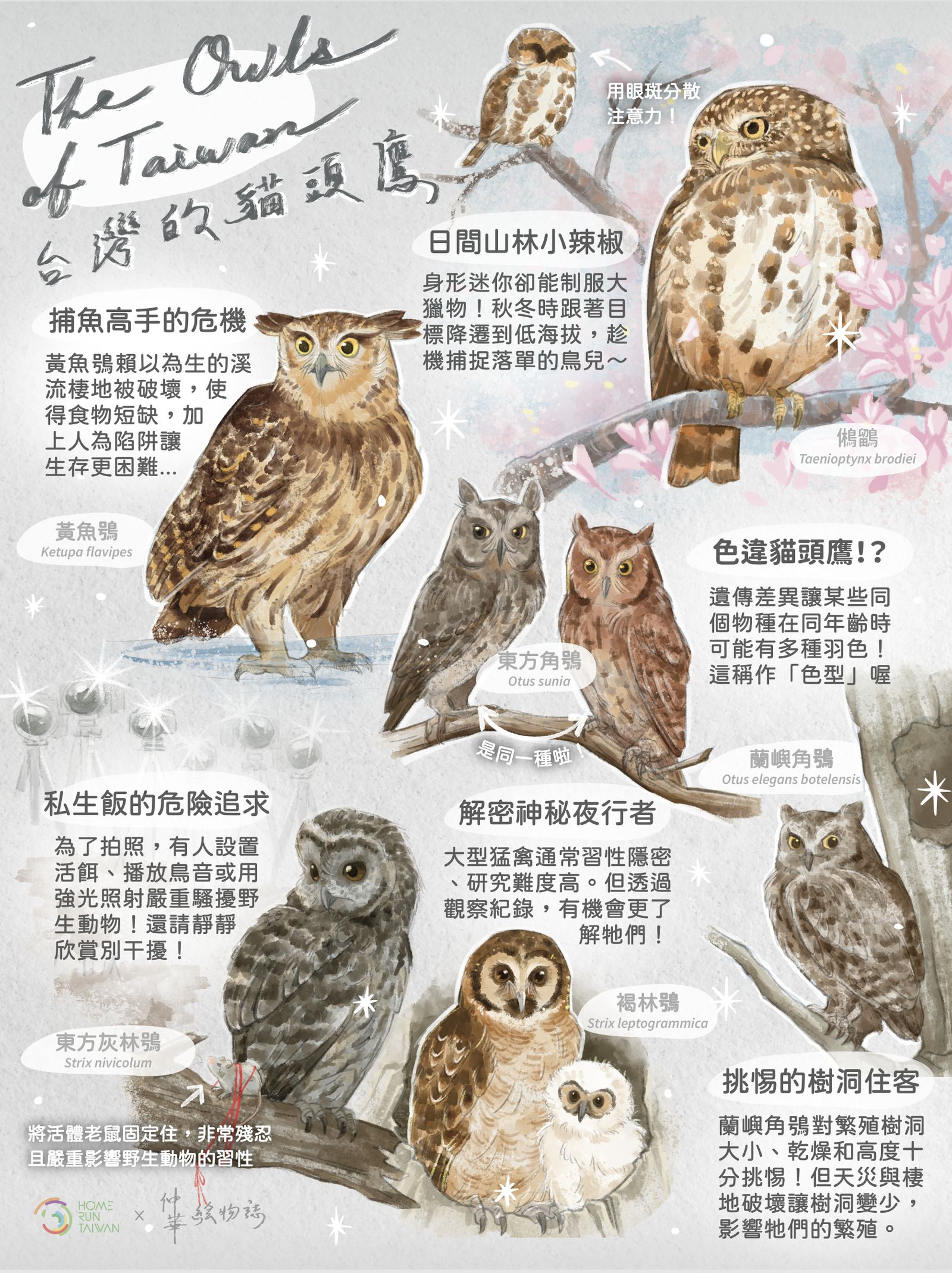 全世界有200多種貓頭鷹,台灣就有12種,種類豐富,是全球分布密度最高的地區之一。
