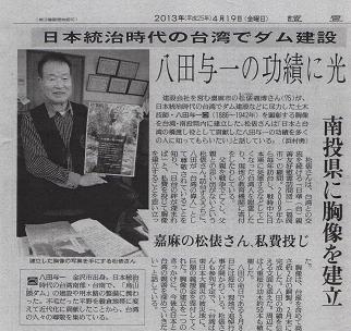 2013年4月19日,日本讀賣新聞專訪松俵義博社長,談論他捐贈在台灣聖山-生態教育園區的八田與一銅像,松俵先生要讓更多日本與台灣的人民知道八田技師的功績與貢獻。