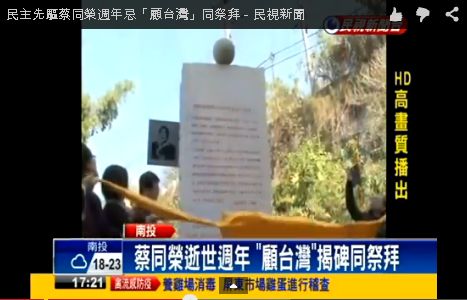 台灣民主先驅,也是民視已故創辦人蔡同榮,逝世滿一週年,各界深深緬懷他對台灣的貢獻,而遵循蔡同榮先生的遺願,由民視所成立的「顧台灣」顧問團,由民視董事長田再庭,率領多位成員,到南投草屯台灣聖山,共同祭拜蔡同榮先生,並且揭開紀念碑,盡訴對他的懷念。