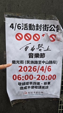 時間:2026/4/6(週一)12:30-17:00 地點:台中市中區繼光街(民族路至中山路口、南園酒家旁) 好民文化行動協會主辦的「2026年的自由路上藝術節」,區間橫跨2月中旬到4月下旬,今年主題為《未竟枝葉》。 合作單位之一的大地,到場宣揚台灣神的精神。近期 「台灣史補課潮」,與關心台灣歷史的朋友,交流人權議題。
