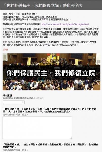 有網友在網路上發起《你們保護民主,我們修復立院》活動,邀請建築、營造、設計等相關人員一同參戰。(圖擷取自你們守護民主,我們修復立院網站)