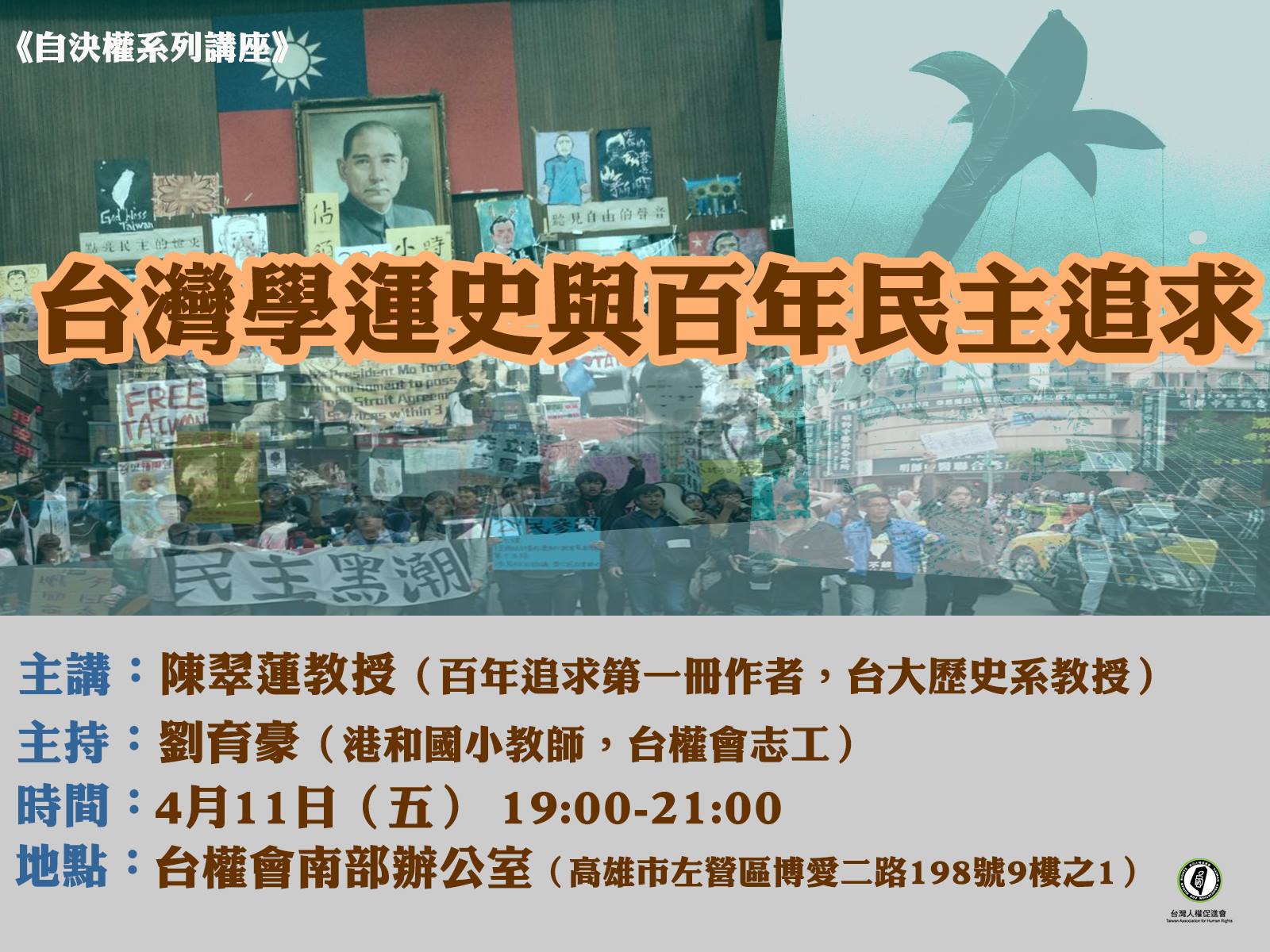 從日治時期到現世台灣,百年民主追求的道路上,總可以看見學生運動的身影。從日治時期起,留學日本的台灣留學生高喊「臺灣是臺灣人的臺灣」開始,到反抗專制的野百合、抵抗國家暴力的野草莓、捍衛民主的太陽花,及歷史長河中大大小小的學生運動,再再地寫下台灣民主歷史的新頁。週五晚上,請一起來聽陳翠蓮老師聊台灣學運史與百年民主追求的故事。