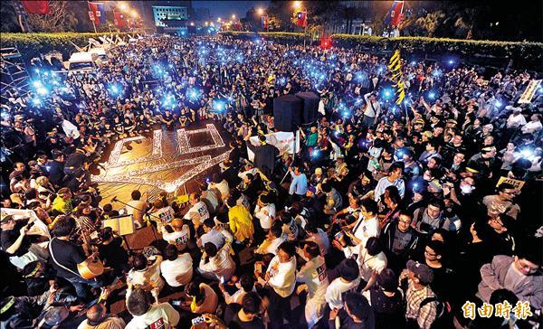 民進黨立院黨團昨晚發起「一人一叩 守護生命」行動,高舉手機、手電筒的民眾在終點的凱道上以蠟燭排出「命」字,象徵守護生命。(記者劉信德攝)