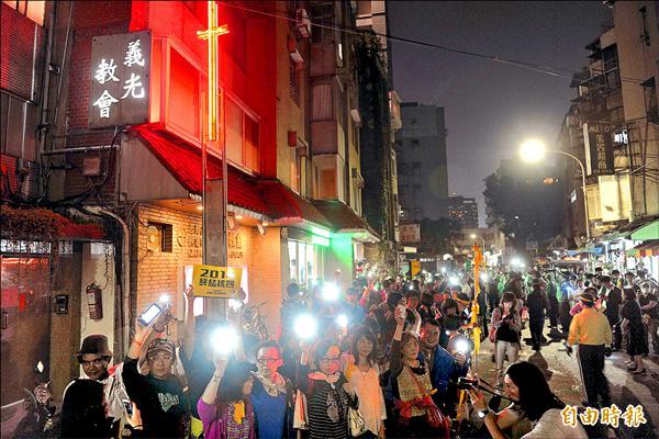 民進黨立院黨團昨晚發起「一人一叩 守護生命」行動,起點選在林義雄禁食的義光教會前,民眾高舉手機、手電筒串成燈河。(記者陳志曲攝)