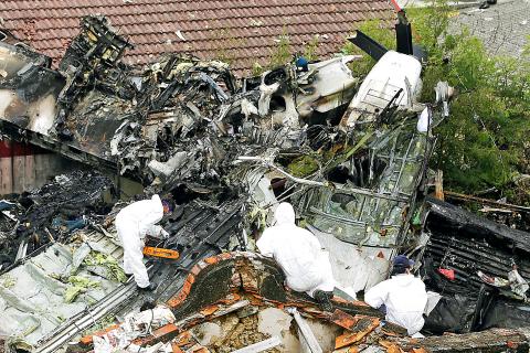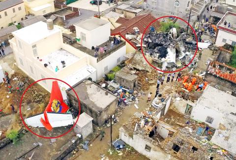 Wreckage of the TransAsia Airways plane crash is strewn over Sisi Village in Penghu yesterday.