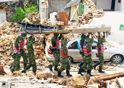 Soldiers remove part of the wreckage of TransAsia Airways Flight GE222 from Sisi Village in Penghu yesterday.