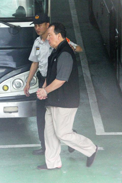 Farglory Land Development Co chairman Chao Teng-hsiung, right, is escorted by a police officer to a hearing at the Taipei District Prosecutors Office in Taipei yesterday morning.