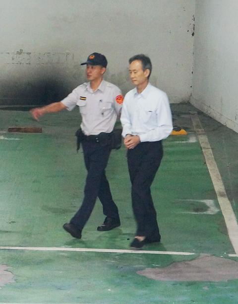 Former Taoyuan County deputy commissioner Yeh Shih-wen, front, is being escorted by police in this undated photo. Yeh has been charged by the Taipei District Prosecutors Office with accepting bribes in connection to an affordable housing project in Taoyuan County’s Bade City.