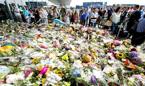 Travelers stop to view the thousands of floral tributes placed in memory of the victims of Malaysia Airlines flight MH17 at Schiphol Airport, near Amsterdam, the Netherlands, on Sunday.