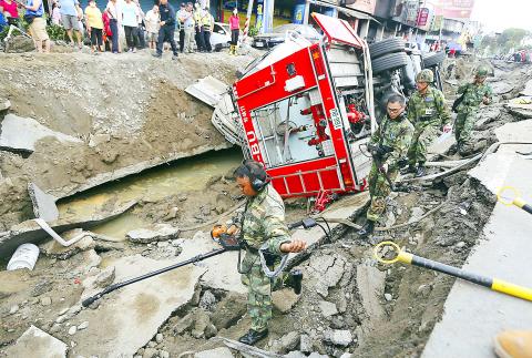 Rescue personnel survey the wreckage after a series of explosions in Greater Kaohsiung early yesterday.