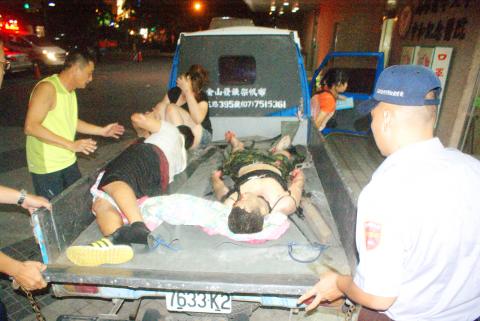 People injured in gas explosions in Greater Kaohsiung are put onto the back of a small truck yesterday due to a lack of ambulances.