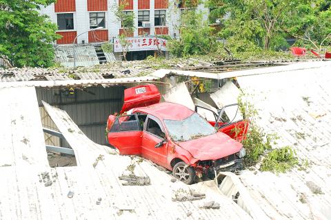 A car is seen in Greater Kaohsiung yesterday after it was blown onto the roof of a three story building due to the strength of a series of gas explosions that shook the municipality from late Thursday night to early yesterday morning.