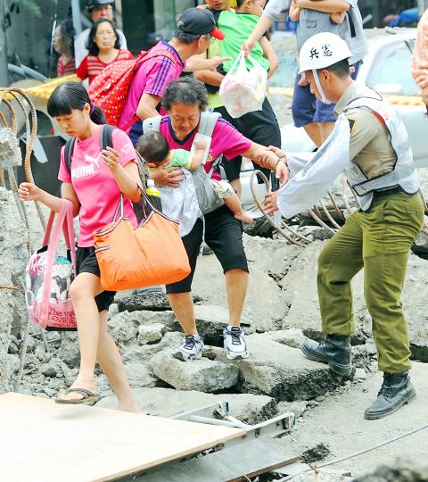 A military police officer helps residents walk on what remains of Greater Kaohsiung’s Sanduo 2nd Road yesterday.