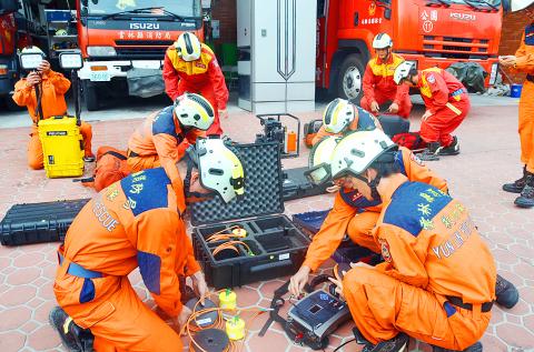 A 10-member team from the Yunlin County Firefighting Department deploys sonar equipment in Greater Kaohsiung yesterday to help with search-and-rescue efforts.