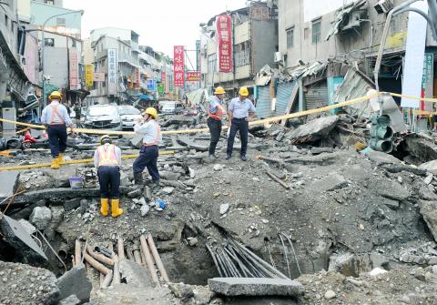 Workers yesterday clean up near exposed pipes in Greater Kaohsiung, which was devastated by a series of explosions on Thursday night and early Friday.