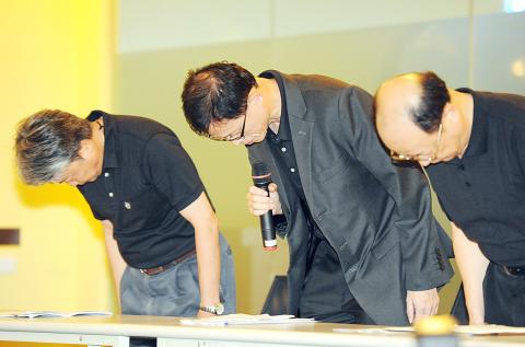 LCY Chemical Corp chairman Bowei Lee, center, apologizes for the gas pipeline explosion disaster during a press conference in Greater Kaohsiung yesterday.