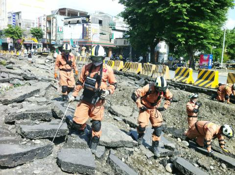 A disaster relief team searches through the rubble of Greater Kaohsiung’s Sanduo Road yesterday following gas pipeline explosions on Thursday night and Friday morning.