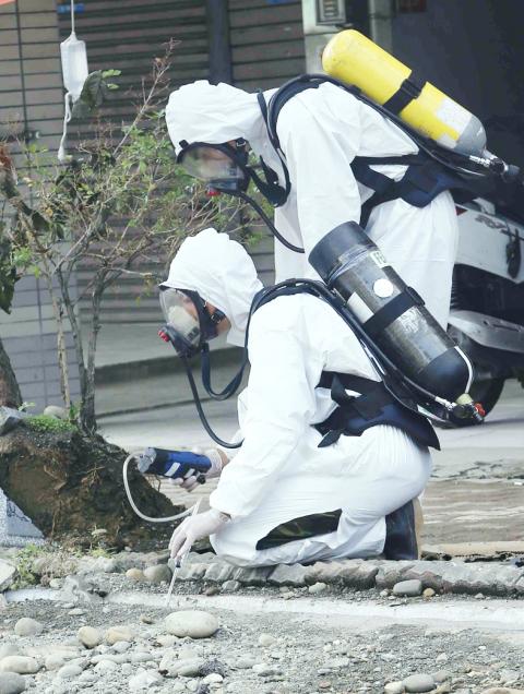 Army chemical experts yesterday take measurements at the site of a pipeline explosions in Greater Kaohsiung, searching for other possible gas leaks.