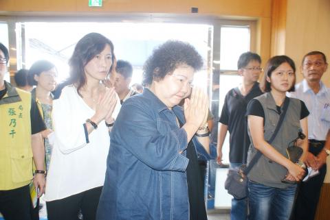 Greater Kaohsiung Mayor Chen Chu, center, yesterday apologizes to relatives of victims of Thursday night’s gas pipeline explosions at the Mortuary Services Office.