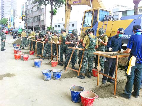 Military personnel and firefighters yesterday continue to search through dirt and rubble for the remains of two firefighters missing after the gas pipeline explosions in Greater Kaohsiung on Thursday night last week.