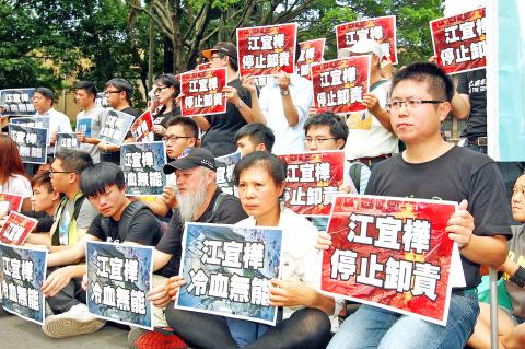 Environmental activists and dozens of Greater Kaohsiung residents yesterday rallied outside the Executive Yuan in Taipei to protest against Premier Jiang Yi-huah’s (江宜樺) remarks on Monday on the government’s plans to address the damage caused by the Greater Kaohsiung gas pipeline explosions and demanding that the premier and Minister of Economic Affairs Chang Chia-juch (張家祝) step down.