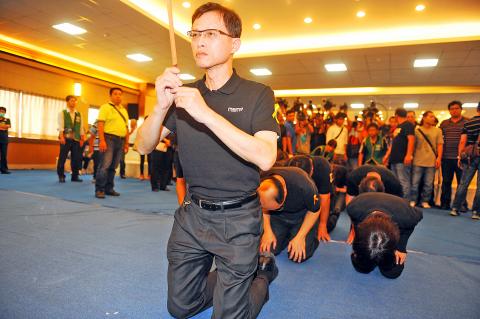 LCY Chemical Corp chairman Bowei Lee yesterday kneels before an altar to the victims of the gas pipeline explosions in Greater Kaohsiung last week at a funeral parlor in the city.