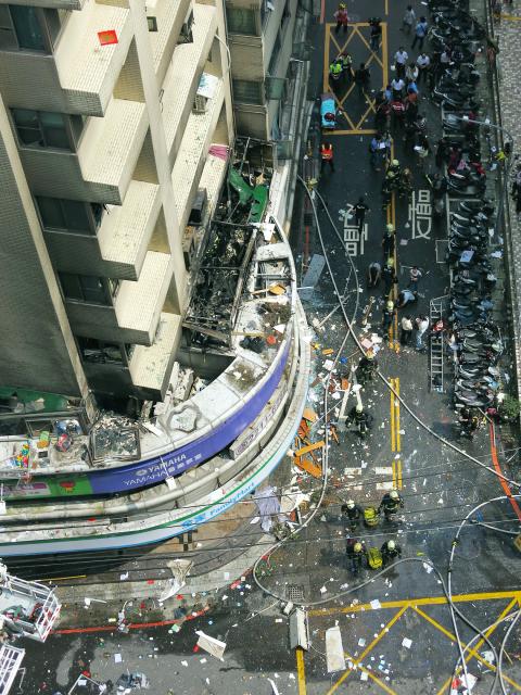 A building in New Taipei City’s Sindian District that was rocked by a gas explosion is pictured from above yesterday.