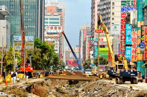 Workers repair a section of road yesterday that was damaged by the gas pipeline explosions in Greater Kaohsiung on July 31 and Aug. 1.