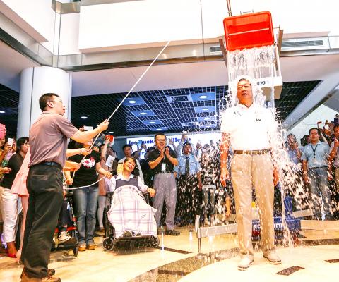 Standing under a bucket controlled by a robotic arm, the chairman of Hon Hai Precision Industry Co, also known as Foxconn in China, was soaked after his wife and an ALS patient in a wheelchair pulled a rope tied to the device.
