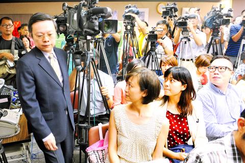 Mainland Affairs Council Minister Wang Yu-chi yesterday enters a news conference in Taipei called to discuss the resignation of former council deputy minister Chang Hsien-yao.