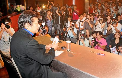 Former Mainland Affairs Council deputy minister Chang Hsien-yao speaks at a press conference in Taipei yesterday, at which he denied accusations that he was a spy.