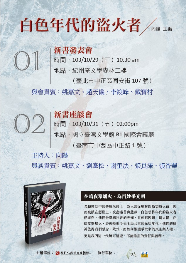 《白色年代的盜火者》預定於10/29上午10點半在台北紀州庵文學森林舉辦新書發表會;10/31下午2點在台南台灣文學館舉辦新書座談會,歡迎有興趣的朋友們蒞臨參加,一起關心台灣的人權議題。