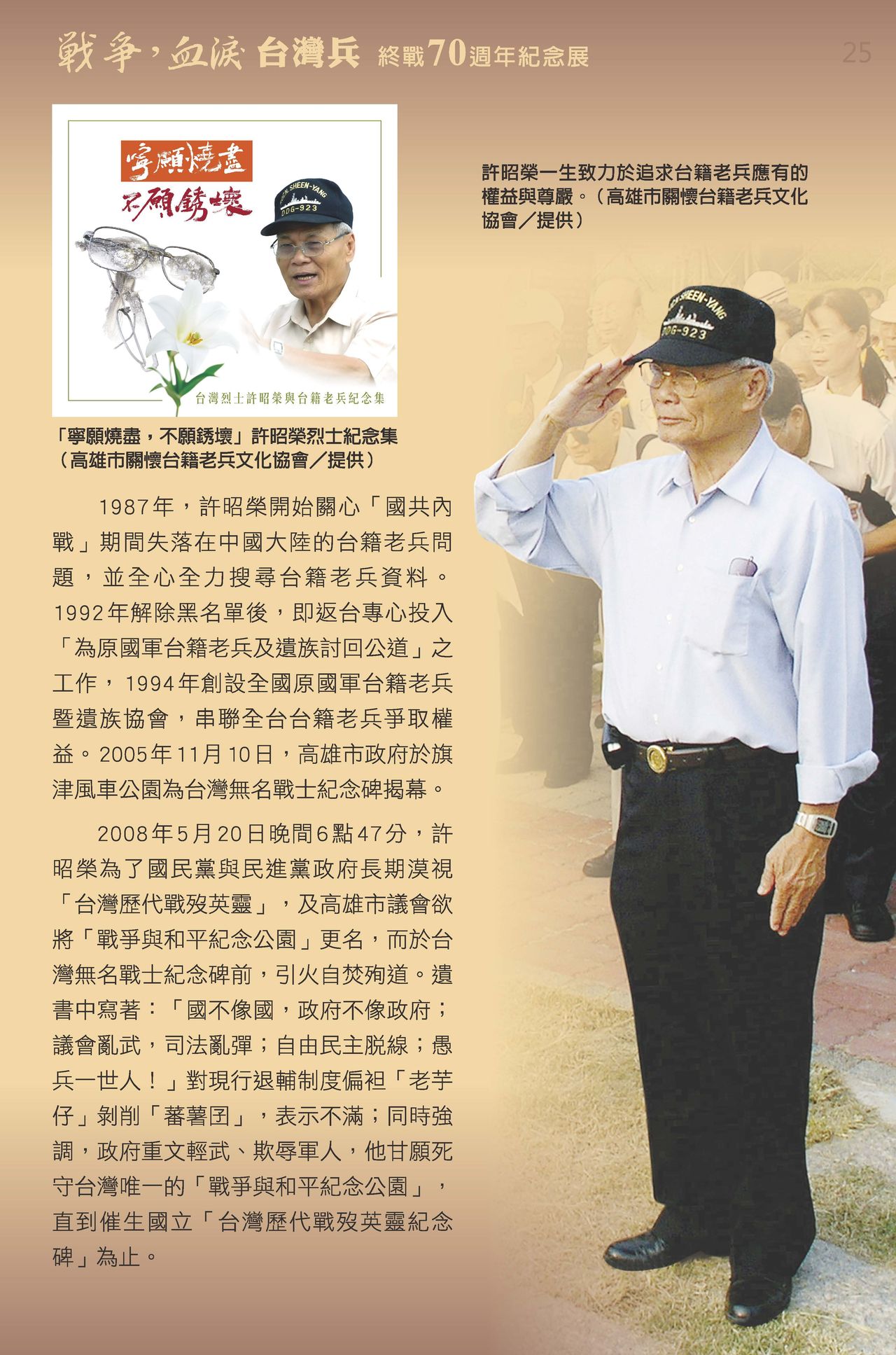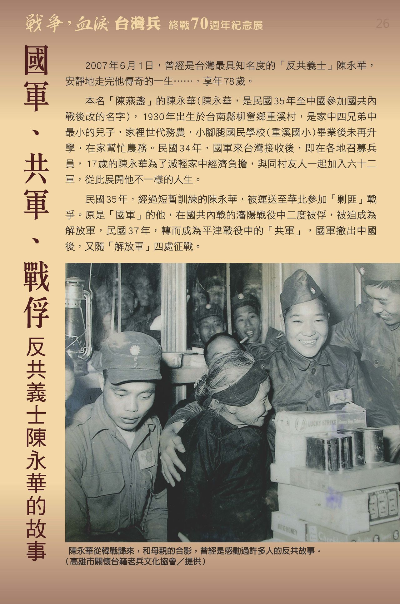 過去戰爭歷史事件中許多台灣人被調派參與戰役,舉凡中日戰爭、太平洋戰爭、國共內戰等皆有台灣兵參與,他們流落異地、戰死沙場,過程辛酸鮮為人知。 為使大眾了解過往的歷史,感懷先烈的犧牲奉獻,特別藉終戰70週年規劃「戰爭˙血淚˙台灣兵-終戰70週年紀念展」,透過第二次世界大戰、國共內戰台籍兵 的故事,呈現這段戰爭歷史。