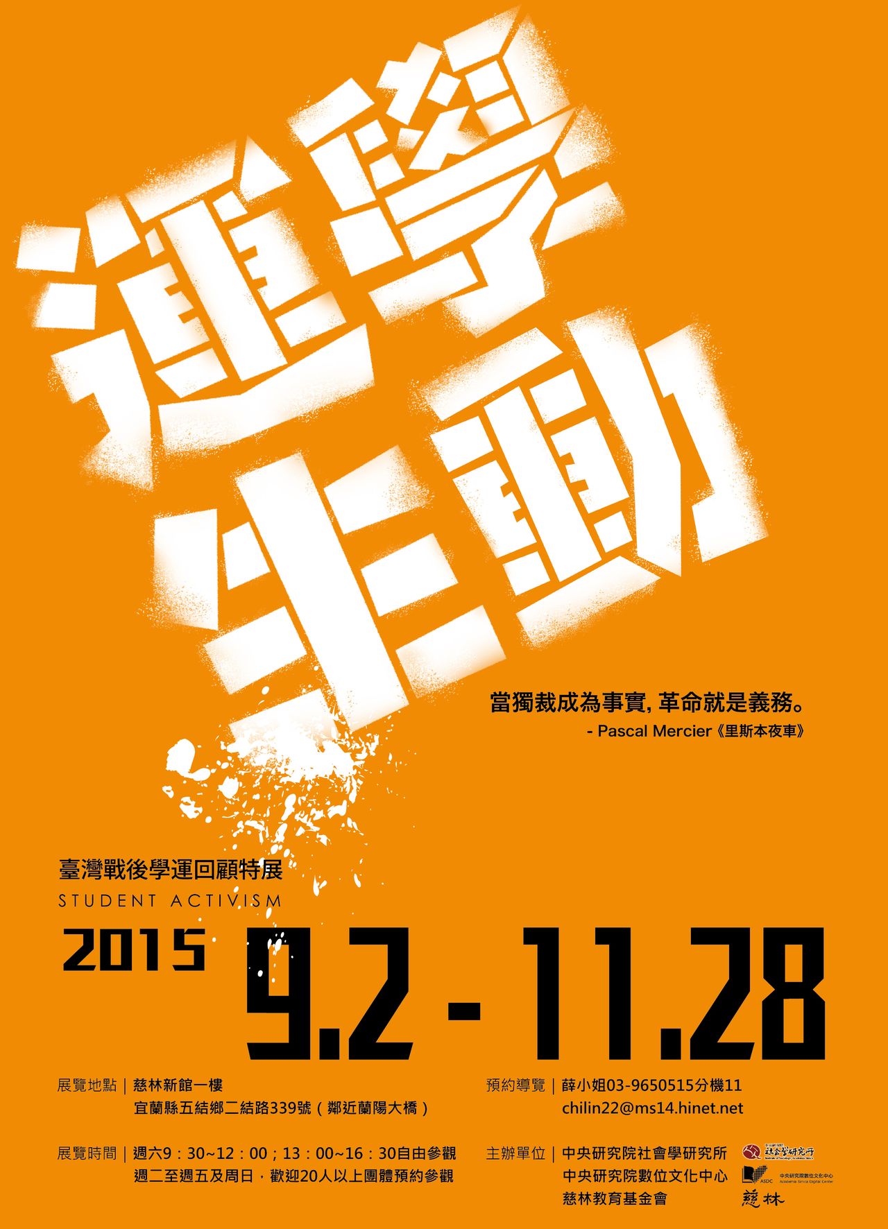 這個展覽記錄了從二次戰後到今年的台灣學生運動歷程,以影音、文字及許多珍貴文物所共同呈現,展期從9月2日起到11月28日,歡迎大家把握這個難得的機會來宜蘭慈林參觀。