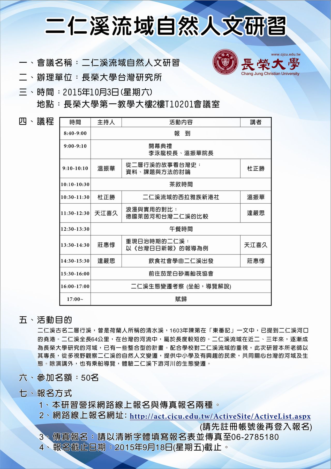 二仁溪古名二層行溪,曾是荷蘭人所稱的清水溪,1603年陳第在「東番記」一文中,已提到二仁溪河口的堯港。二仁溪全長64公里,在台灣的河流中,屬於長度較短的。二仁溪流域在近二、三年來,逐漸成為長榮大學研究的河域,已有一些整合型的計畫。配合學校對二仁溪流域的重視,此次研習本所老師以其專長,從多視野觀察二仁溪的自然人文變遷,提供中小學教師及有興趣的民眾,共同關心台灣的河域及生態。除演講外,也有乘船導覽,體驗二仁溪下游河川的生態變遷。