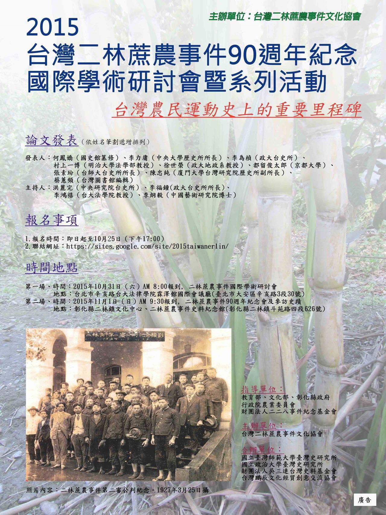 為紀念台灣二林蔗農事件90週年,本會特舉辦『台灣二林蔗農事件90週年國際學術研討會暨系列活動』(暫定名稱)。邀請海峽兩岸及日本學者專家,發表相關論文,編輯製作論文集,以及參訪彰化『二林蔗農事件』史料館、紀念碑、事件相關遺跡……等尋跡活動。