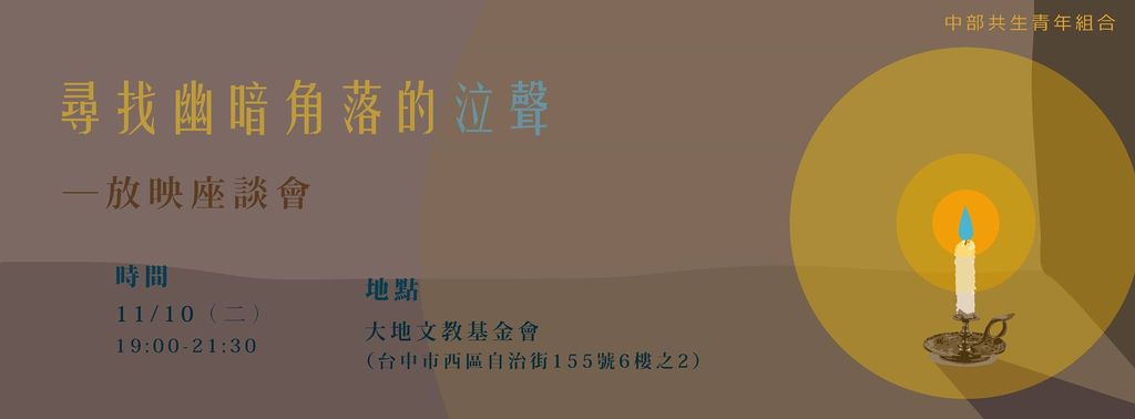 歡迎想對二二八有更多認識的朋友,11月10日晚上7點,一同到大地文教基金會(台中市西區自治街155號6樓之2)與我們共聚;讓我們藉由《尋找幽暗角落的泣聲》,重新反思這段歷史與悲傷。