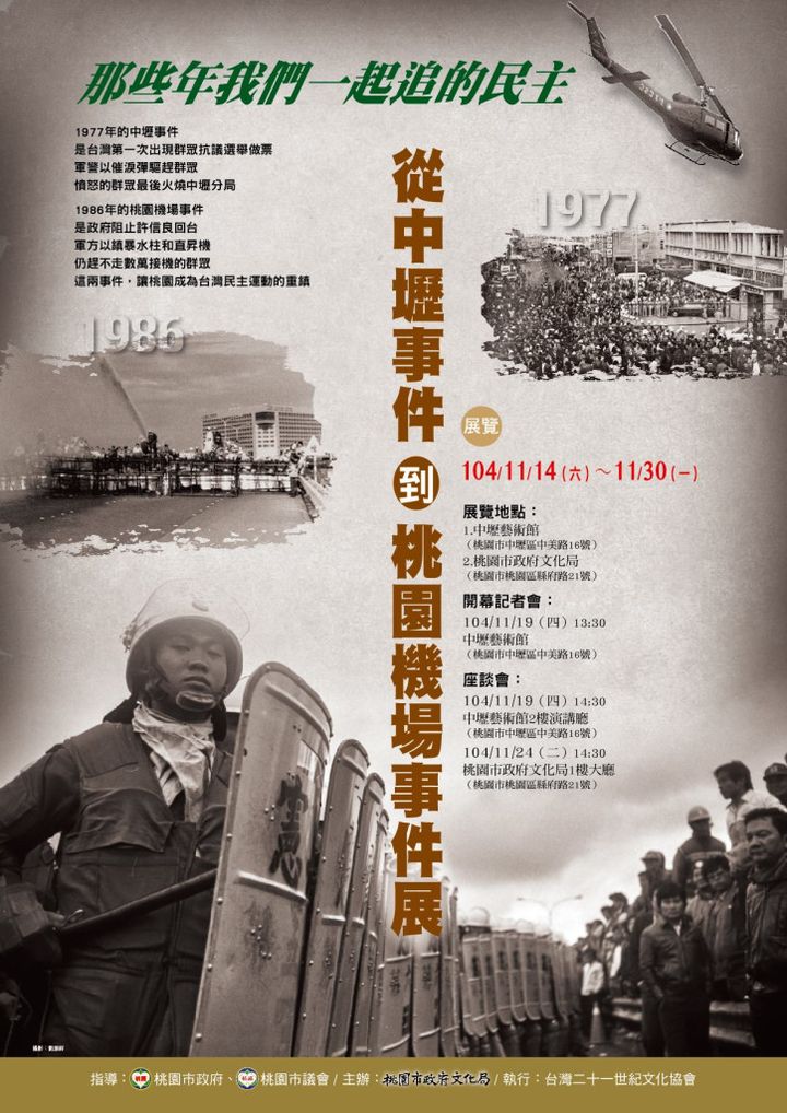 1977年的中壢事件,是台灣第一次出現群眾抗議選舉做票,軍警以催淚彈驅趕,群眾火燒中壢分局。由桃園市政府指導、文化局主辦「那些年我們一起追的民主--從中壢事件到桃園機場事件展」,從今天(14日)起在桃園市文化局及中壢藝術館展出。