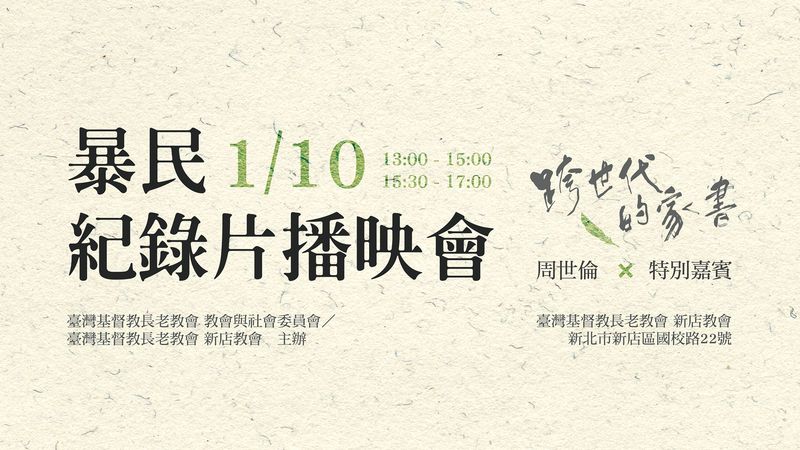 地點:台灣基督長老教會新店教會(距捷運新店站150公尺) 日期:2016/1/10(日) 第一場:下午1:00 第二場:下午3:30 片長90分鐘加上映後分享1小時~ 特別來賓:周世倫導演....等 本片即將前往德國參展,是一部報導太陽花學運參與者心路歷程的紀錄片。想了解外省第三代在想什麼,學運學生家人的態度轉變原因,翻轉台灣政經處境的重大關鍵,千萬不能錯過。記得準備夠多的衛生紙來看。感謝周世倫導演奉獻試映。