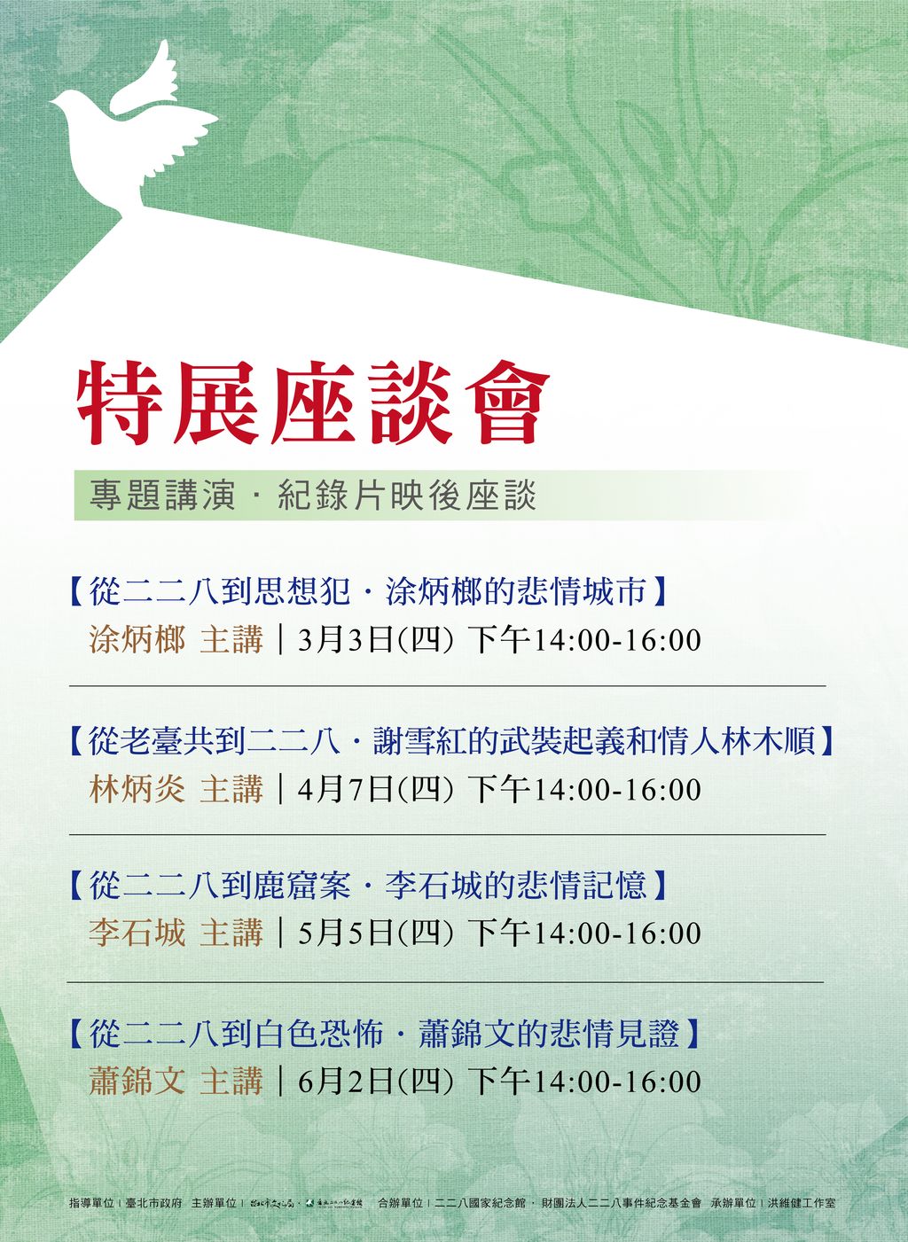 本次展覽展出台北二二八紀念館典藏部分相關二二八及白色恐怖之文物史料,如二二八事件時期陳儀為實施清鄉,大舉鎮壓各地民眾而頒布「為實施清鄉公告民眾書」、「各鄉鎮辦理清鄉書」,以及白色恐怖時期「號召匪諜自首,獎勵檢舉匪諜」等相關文獻;此外,較特別之處為二二八事件受害者盧鈵欽醫師於獄中寫給妻子之遺書,深情而悲愴,顯現與摯愛離別的苦痛,由此也道出當時許多社會菁英因政治迫害,而與家人分離的悲情歷程;還有因白色恐怖時期林政亨讀書會事件牽連受害之蕭慶璋,在獄中槍決前親手做成之手工相冊。