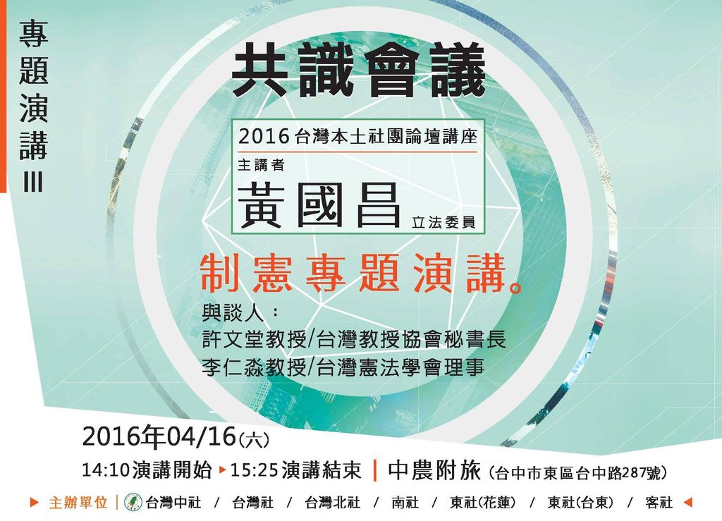 制憲專題演講 主講者:黃國昌立法委員 與談人:許文堂教授 / 台灣教授協會秘書長 李仁淼教授 / 台灣憲法學會理事 時間:2016年4月16日(六),下午14:10 ~ 15:25 地點:中農附旅(前教師會館)一樓弘道廳 台中市東區台中路287號