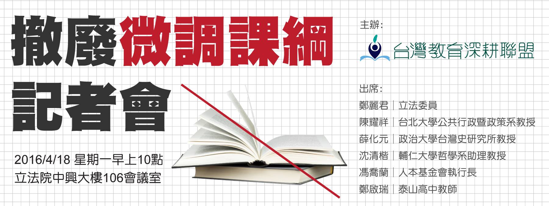 2014年通過國文 科與社會科微調課綱,由於程序與專業問題有相當瑕疵,特別是公民與歷史兩科問題最為嚴重,引發學術界與輿論強烈的批判。2015年根據微調課綱編撰的教科 書使用前,更引發學生抗議行動。2016年3月,行政院雖表示若立法院通過要求教育部撤廢微調課綱,會尊重立法院的決議。但是,教育部則認為必須重啟程 序,才能廢止微調課綱。